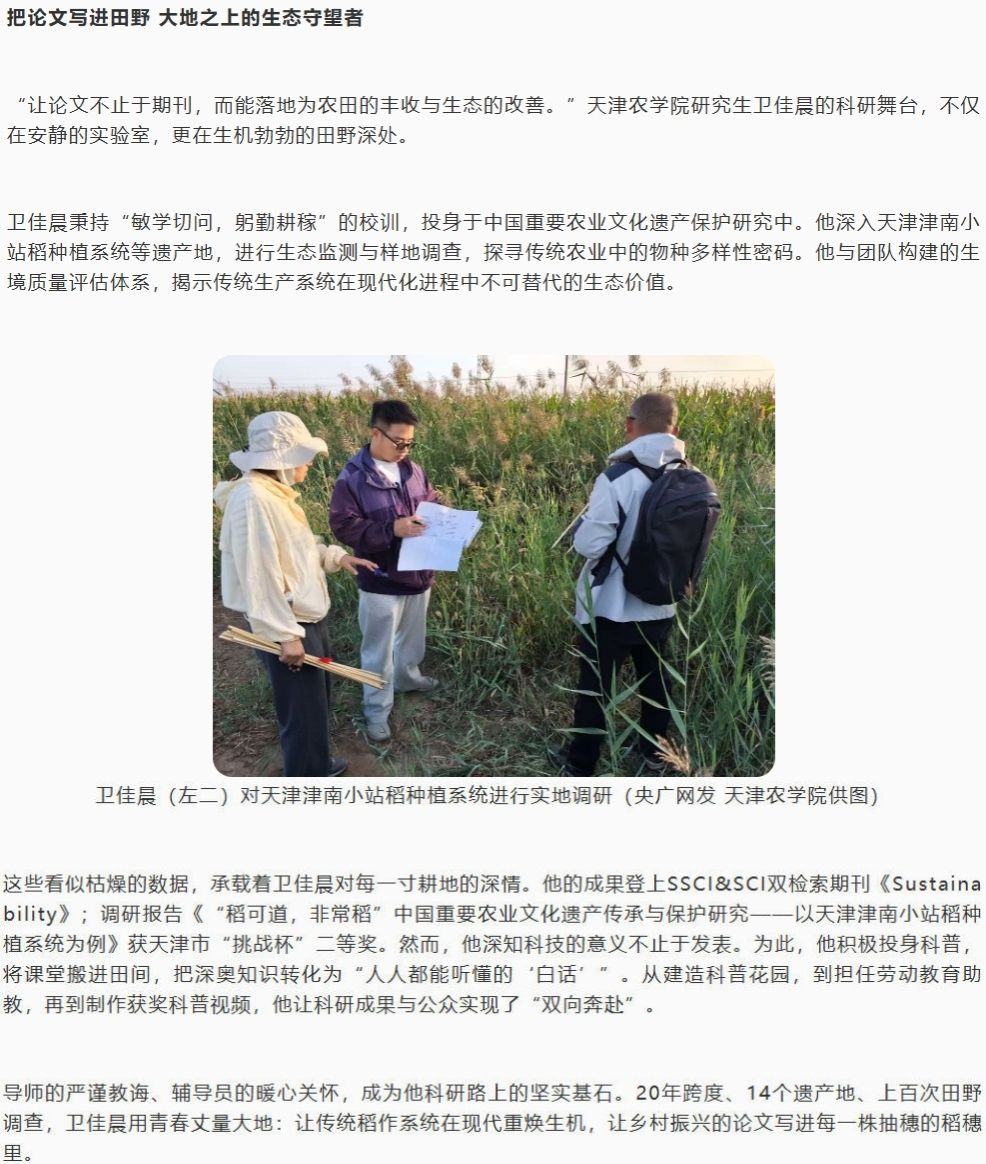 2025年10月13日,央广网客户端以《青春华章|以奋斗姿态激扬青春、实现梦想》为题,报道贝博研究生卫佳晨秉持“敏学切问,躬勤耕稼”的校训,投身于中国重要农业文化遗产保护研究中。他深入天津津南小站稻种植系统等遗产地,进行生态监测与样地调查,探寻传统农业中的物种多样性密码。他与团队构建的生境质量评估体系,揭示传统生产系统在现代化进程中不可替代的生态价值。