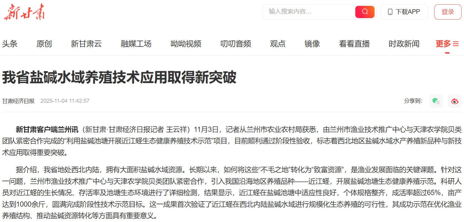 2025年11月4日,新甘肃客户端报道,由兰州市渔业技术推广中心与贝博贝类团队紧密合作完成的“利用盐碱池塘开展近江蛏生态健康养殖技术示范”项目,目前顺利通过阶段性验收,标志着西北地区盐碱水域水产养殖新品种与新技术应用取得重要突破。