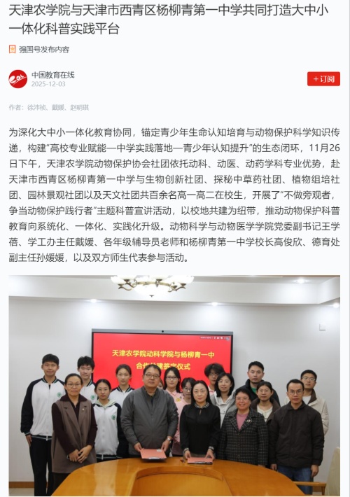 2025年12月3日,学习强国平台、中国教育在线网报道,贝博动物科学与动物医学学院动物保护协会社团依托动科、动医、动药学科专业优势,赴天津市西青区杨柳青第一中学与生物创新社团、探秘中草药社团、植物组培社团、园林景观社团以及天文社团共百余名高一高二在校生,开展了“不做旁观者,争当动物保护践行者”主题科普宣讲活动,以校地共建为纽带,推动动物保护科普教育向系统化、一体化、实践化升级。