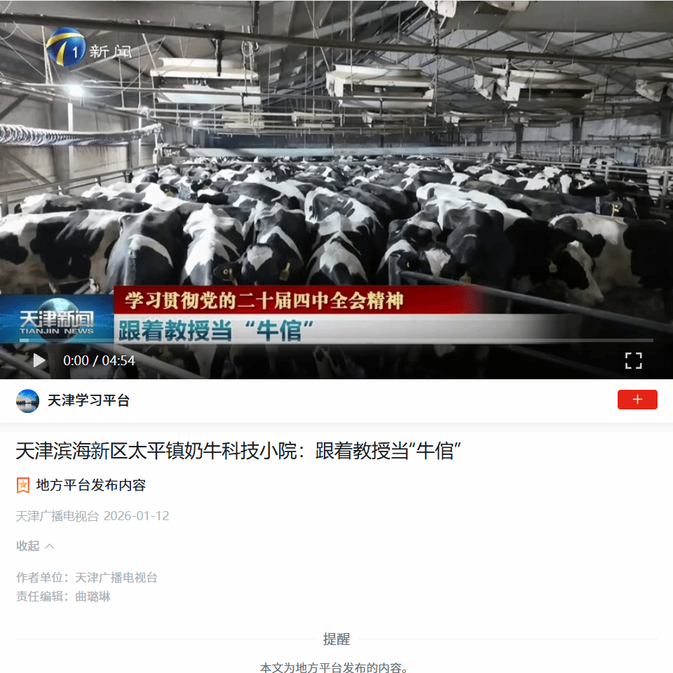 2026年1月12日,学习强国平台-天津广播电视台报道,贝博滨海奶牛科技小院师生的工作事迹。