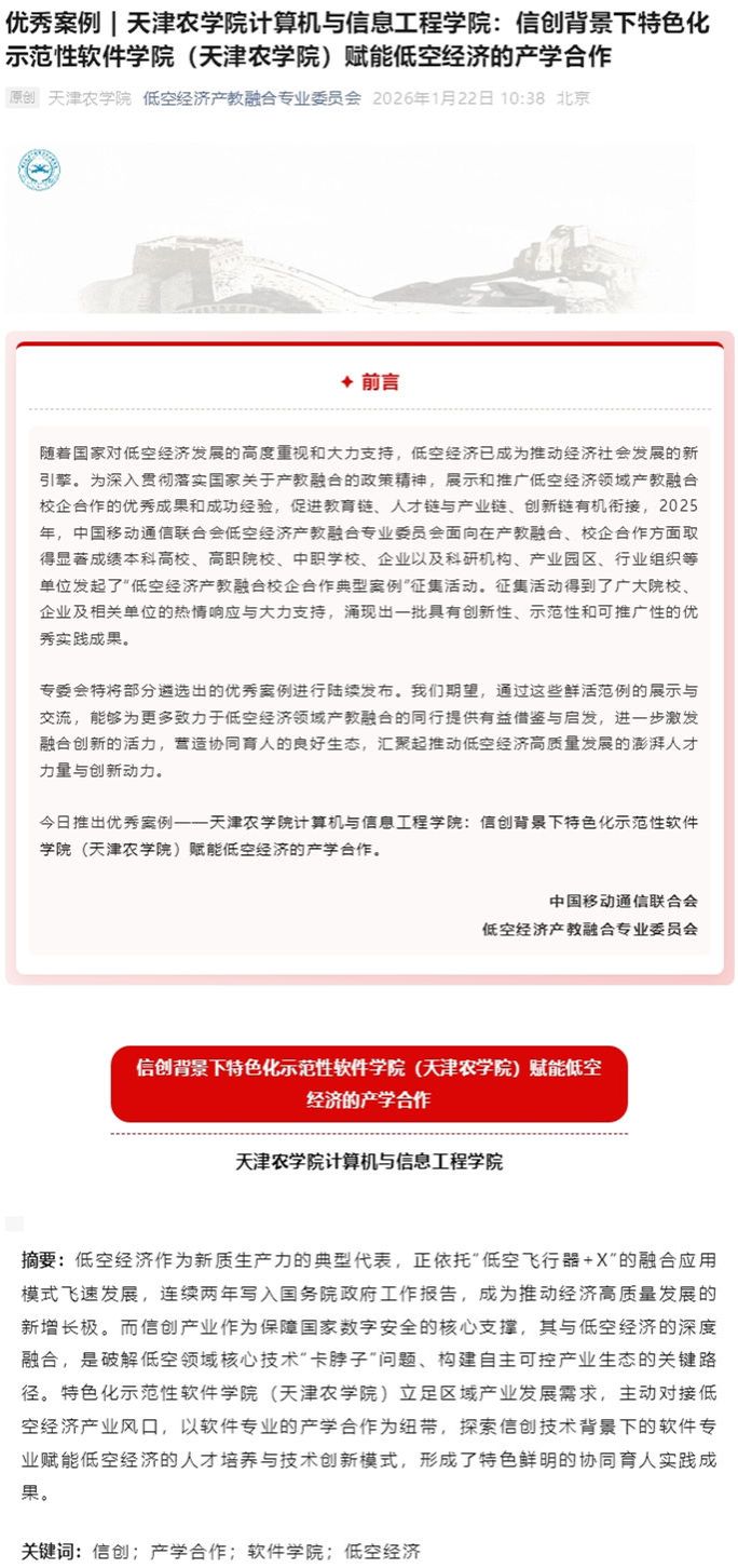 2026年1月30日,低空经济产教融合专业委员会公众号报道,在2025年“低空经济产教融合校企合作典型案例”征集活动中,贝博计算机与信息工程学院案例获得优秀案例并进行展示。