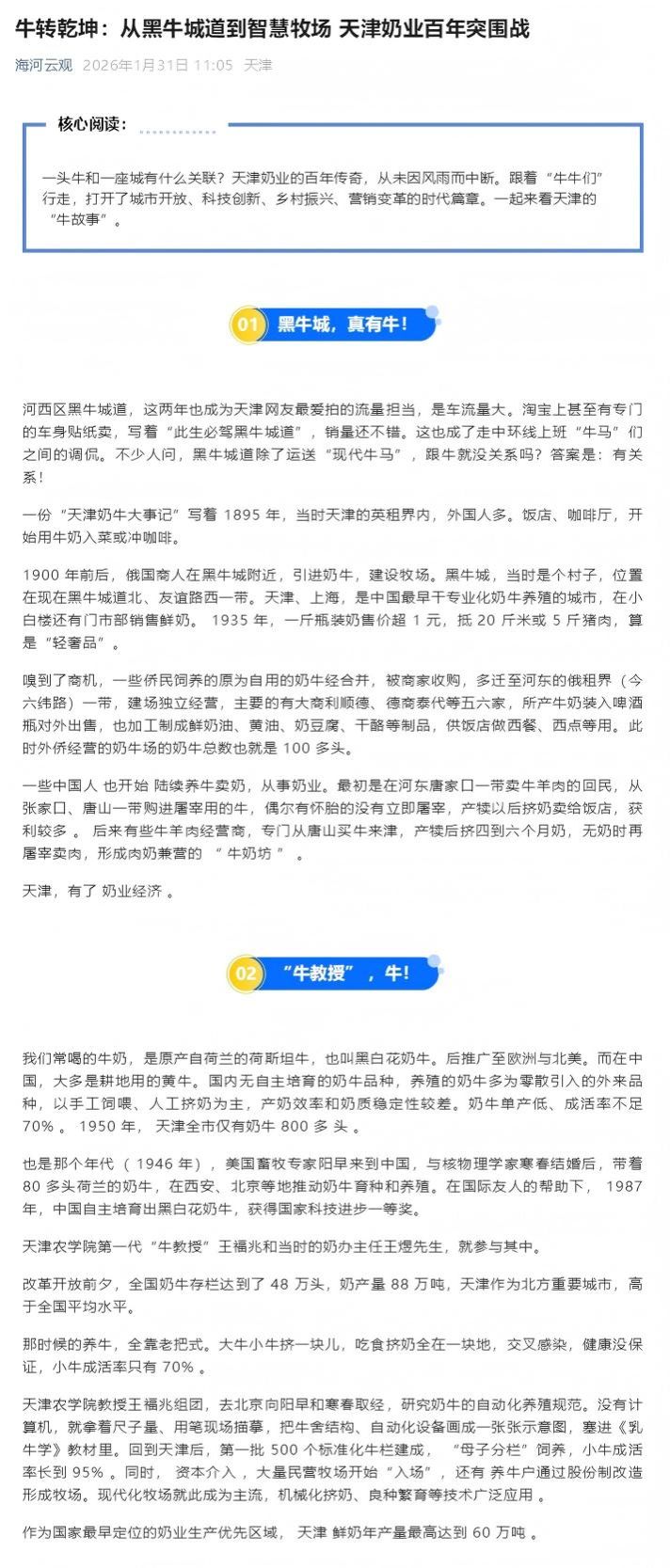 2026年1月31日,海河云观公众号报道,贝博第一代“牛教授”王福兆、第二代“牛教授”张学炜,持续助力天津奶业发展的事迹。