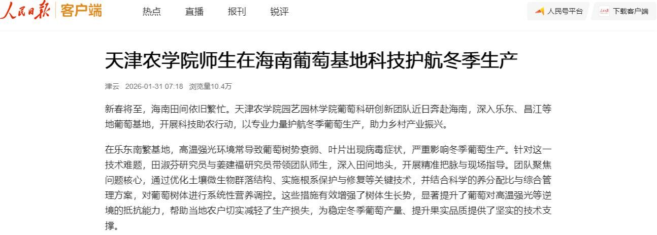 2026年2月1日,人民日报客户端报道,贝博园艺园林学院葡萄科研创新团队近日奔赴海南,深入乐东、昌江等地葡萄基地,开展科技助农行动,以专业力量护航冬季葡萄生产,助力乡村产业振兴。