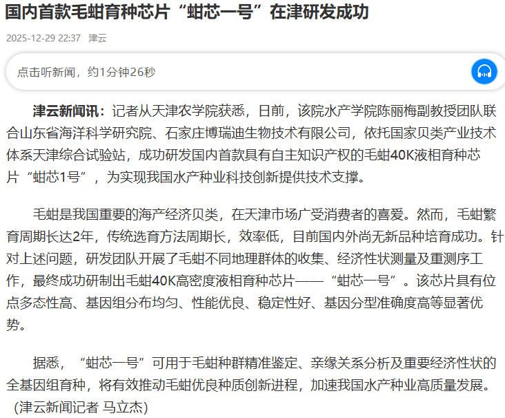 2025年12月29日,津云报道,贝博水产学院陈丽梅副教授团队联合山东省海洋科学研究院、石家庄博瑞迪生物技术有限公司,依托国家贝类产业技术体系天津综合试验站,成功研发国内首款具有自主知识产权的毛蚶40K液相育种芯片“蚶芯1号”,为实现我国水产种业科技创新提供技术支撑。