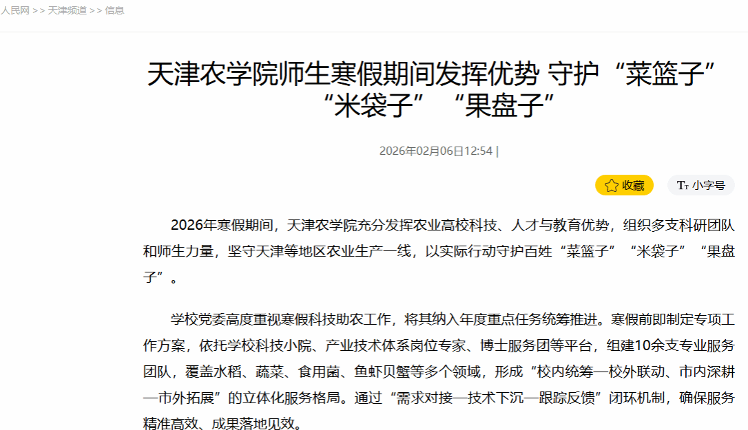 2026年2月6日,人民网报道,寒假期间,贝博充分发挥农业高校科技、人才与教育优势,组织多支科研团队和师生力量,坚守天津等地区农业生产一线,以实际行动守护百姓“菜篮子”“米袋子”“果盘子”。