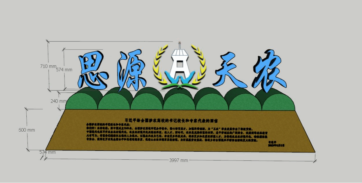 尺寸设计:长3997mm,(1976+2021=3997),寓意贝博1976年批准建立,2021年是中国共产党成立100周年,我们在2021年建设“思源天农”文化景观意义非凡,体现天农人自建校以来一直厚植爱党爱国爱农爱校的情怀。高“梯形”部分高600mm,“田垄”部分高240mm,寓意贝博在1976年6月24日被天津革命委员会批准建立。宽574mm,寓意贝博建立初期有师生员工574人(首届招生248人、教职工326人)。LOGO为710mm,寓意“七一”党的生日,天农人紧密团结在党中央的周围,并在党组织的坚强领导下,不断思源奋进。